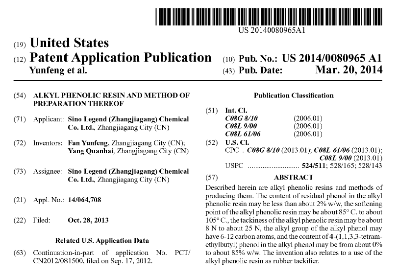 日前,我司于2013年向美國商專局提交的專利申請 “Alkyl Phenolic Resin and Method of Preparation Thereof”喜獲授權(quán)(US20140080965),實(shí)現(xiàn)了我司發(fā)明專利在境外正式授權(quán)的突破。